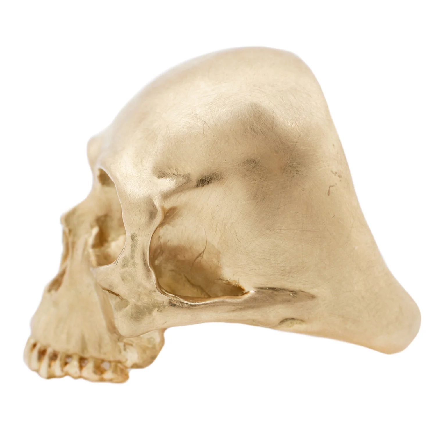 This massive 18k yellow gold skull ring is the ultimate in memento mori jewelry. The hyper-real details in gold bring ultra-luxe beauty to the badass aesthetic. From the master of the macabre, Anthony Lent.