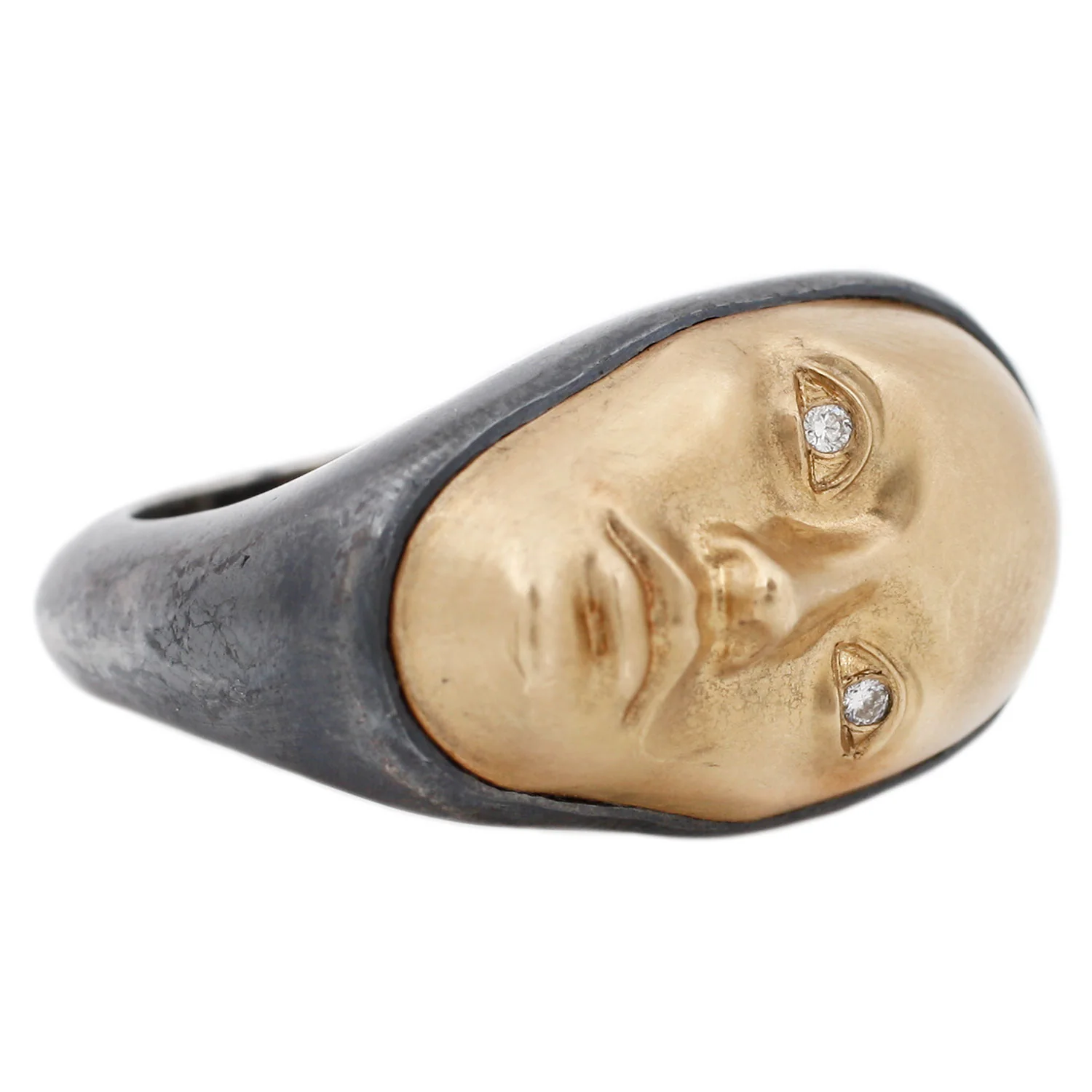 An 18k yellow gold face lays horizontally along an oxidized silver band. Her eyes glow with white diamonds and her her satiny gold skin contrasts with eitherĀ a smoky dark silver band or bright silver band. From the bench of master jeweler, Anthony Lent.