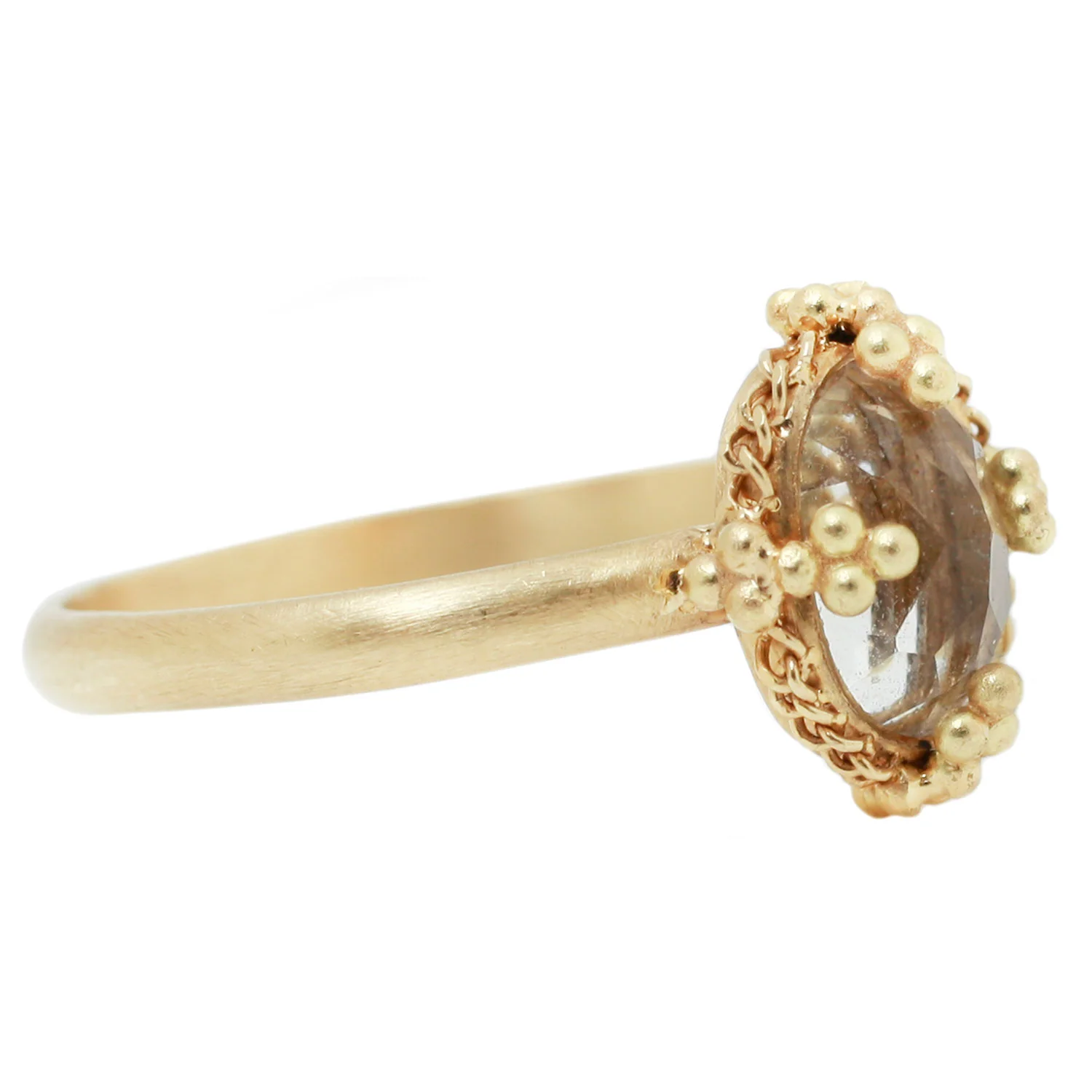 A braided gold halo surrounds a glowing white topaz on this solitaire ring by Amali. Complete with her signature granulated prongs and thick gold band, this solitaire makes a beautiful statement.