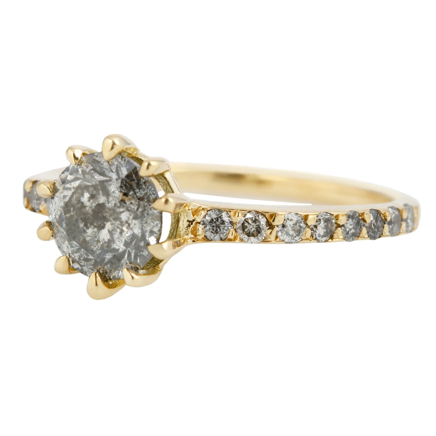 A classic solitaire design gets an upgrade with dark and smoky salt and pepper diamonds. Ten shiny gold prongs clasp the round gray stone. Pavé salt and pepper diamonds run along either side of the yellow gold band. Elegance and grace by Lauren Wolf.