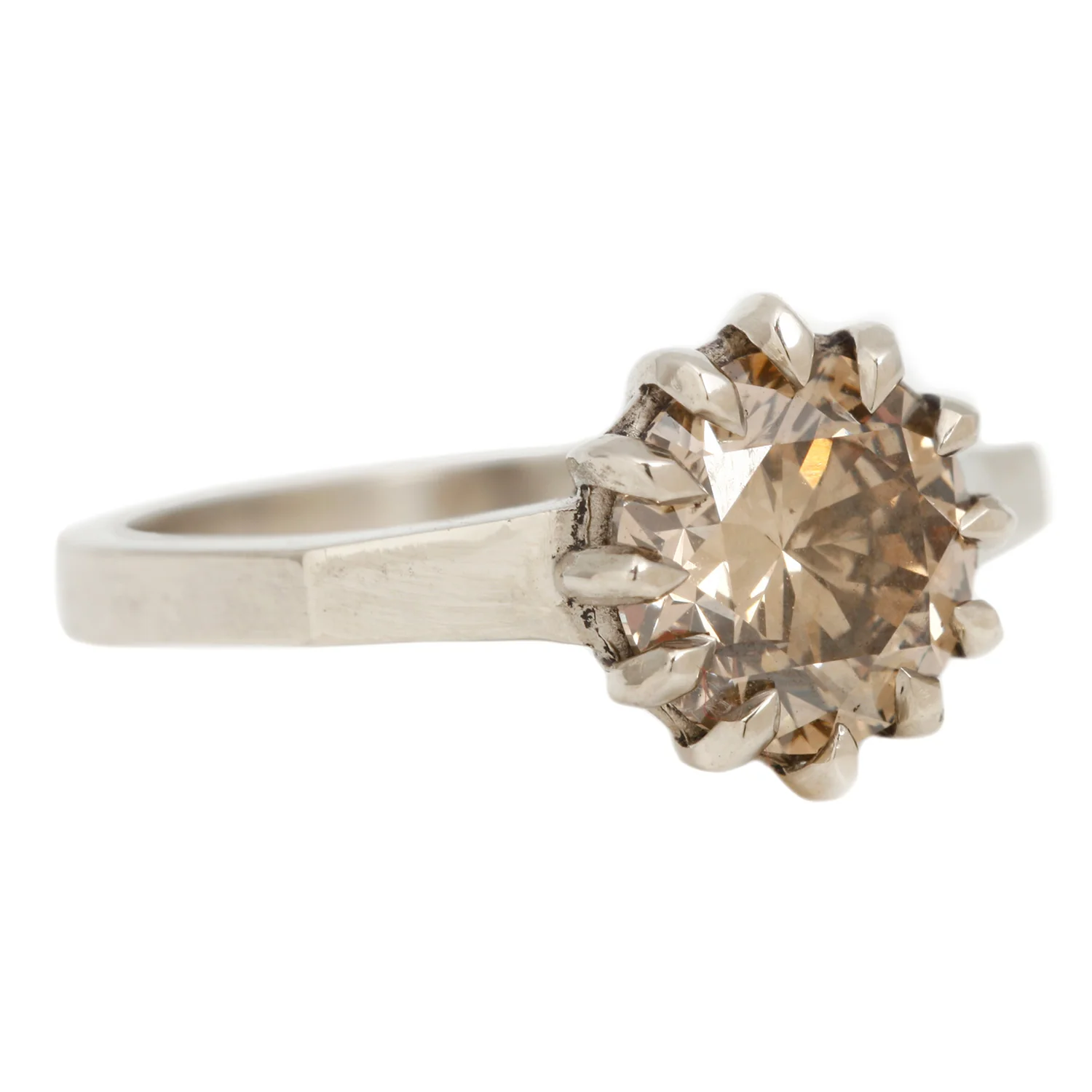 A brilliant cut champagne diamond bubbles with brightness from an 18k white gold band. 2.02 carats are cause for celebration! Diamond diameter is 10mm and band width is 2mm. One of a kind.