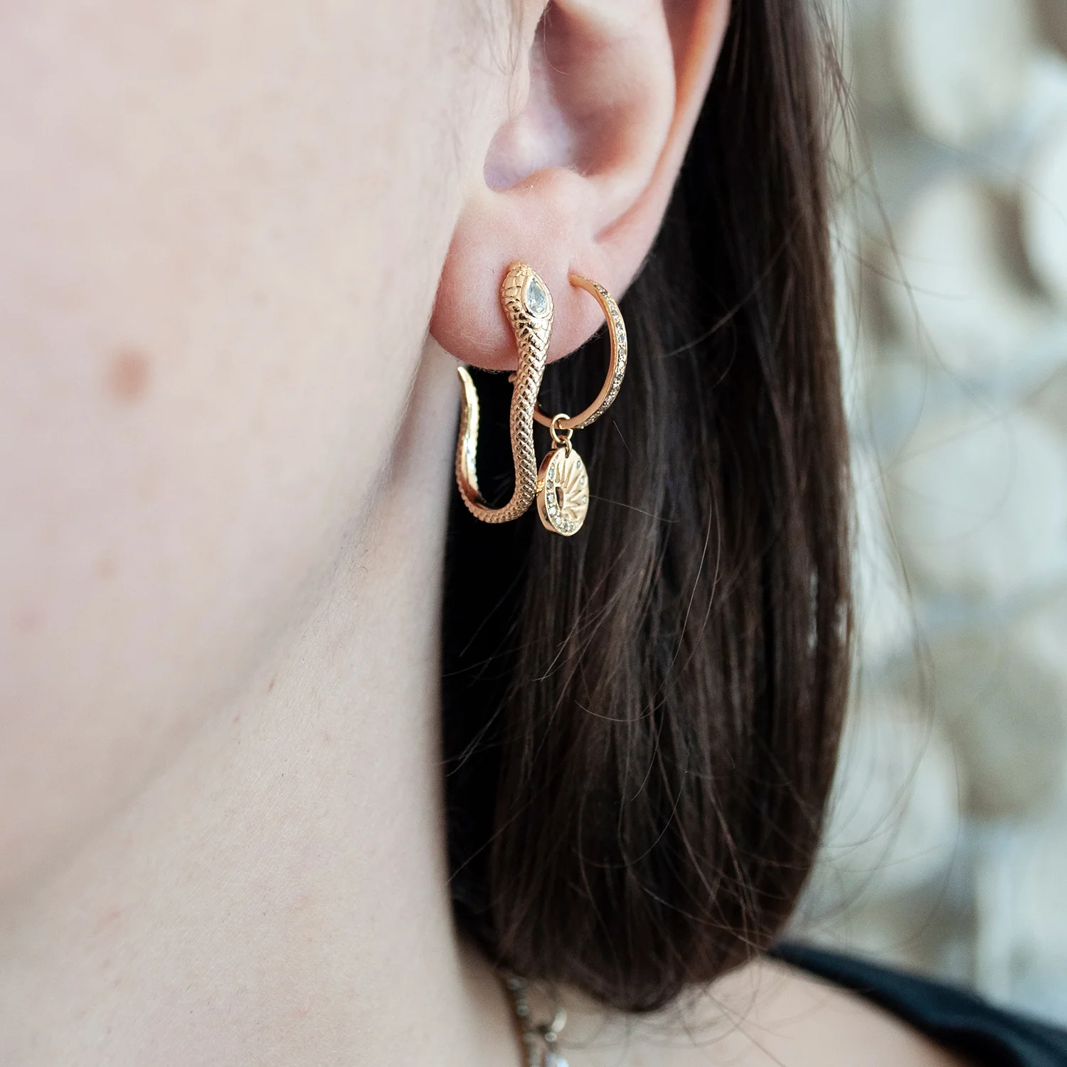 Sly cobras slither around the ear with shimmering white diamonds adorning their hoods. The Cobra Charmer Mini Hoops from Celine DāAoust are exquisitely detailed with a naturalistic snakeskin texture.
