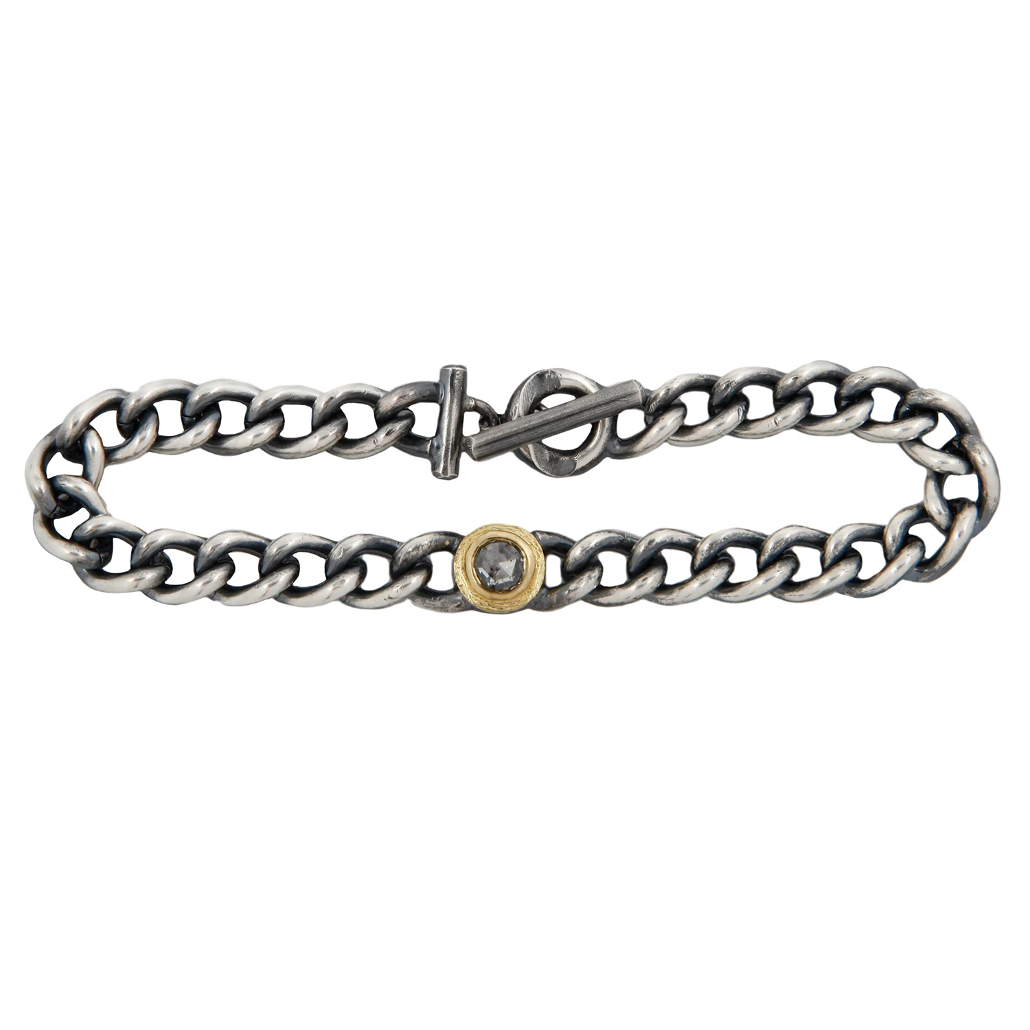 Metal: Silver Curb Chain, 18k Yellow Gold Bezel