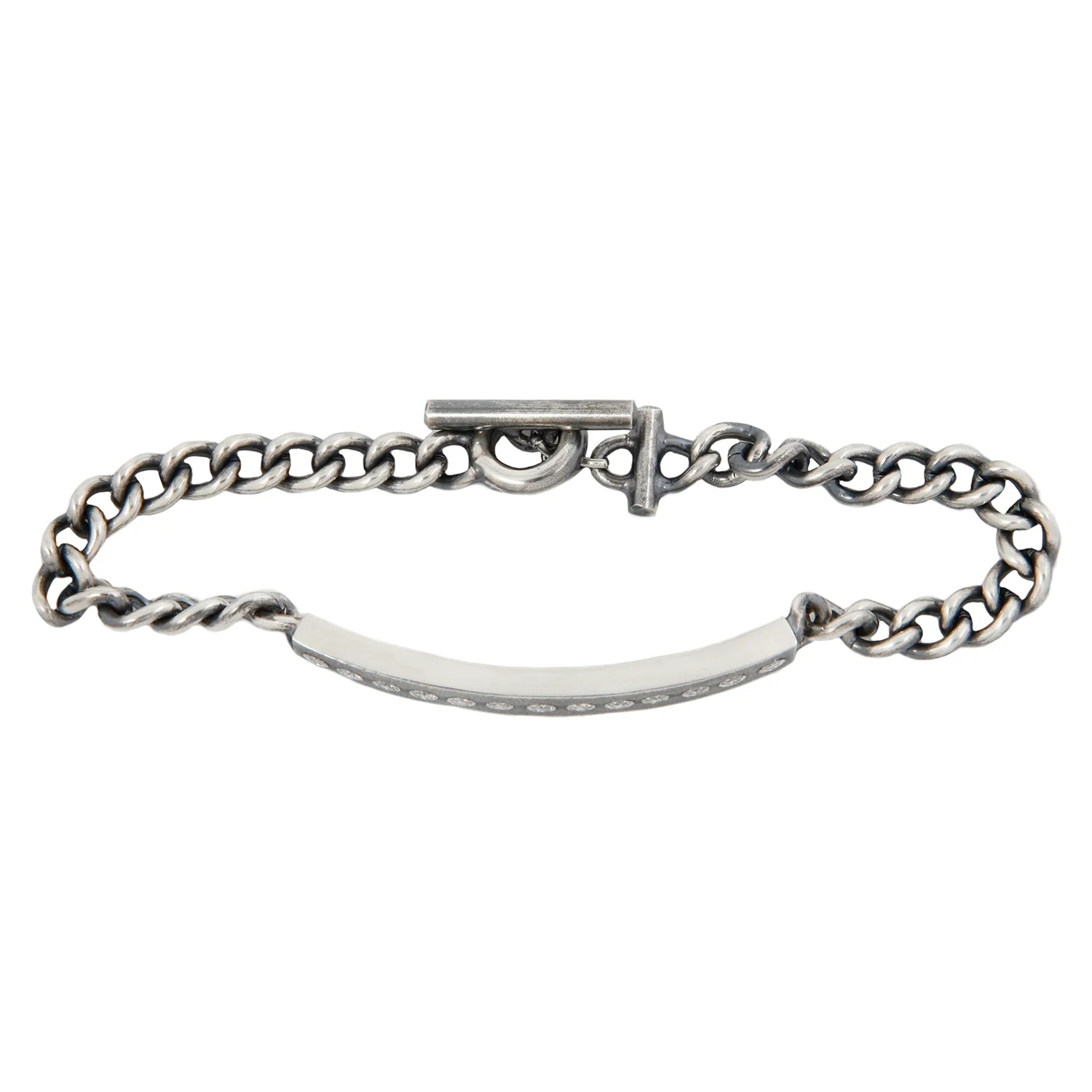 Edgy and eye-catching, yet totally classic. Shimmering white diamonds are flush set, in-line along a silver ID bar. The chunky curb chain with hefty toggle clasp adds a gritty edge to the luxe diamonds. Handcrafted by Rene Escobar.