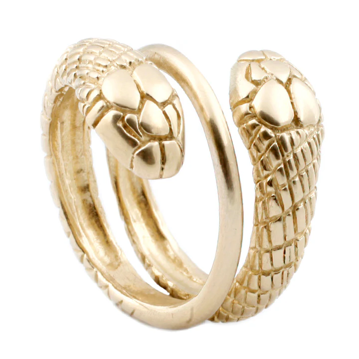 A two-headed serpent wraps around the finger in rich 14k gold. Both snake heads sit perfectly positioned for a fierce yet graceful look. Katrina LaPenne hand carves each ring in wax before fabricating them in recycled metal.