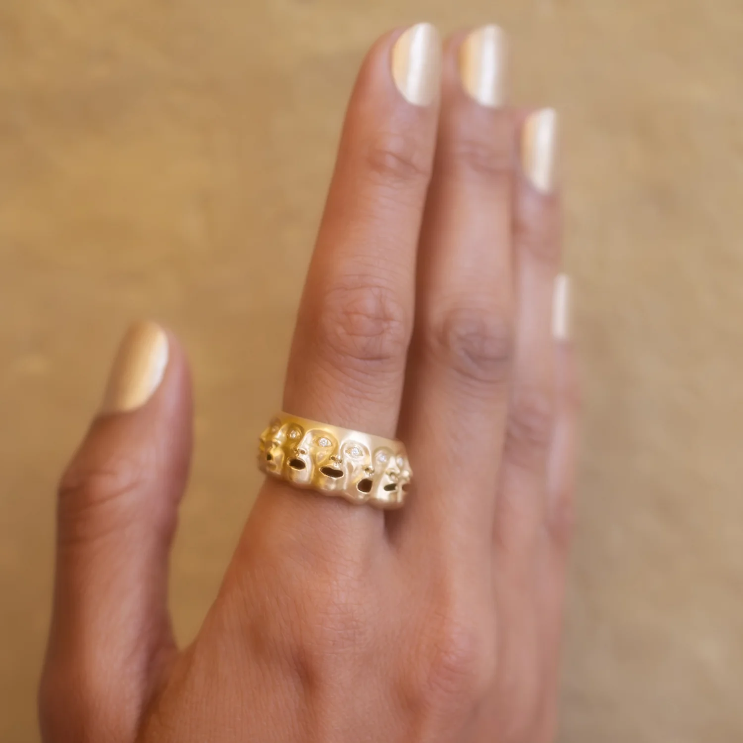 Confront the range of human emotion with Anthony Lent's modern take on an ancient universal symbol. The depiction of expressive faces merged together has appeared in art all over the world for centuries. Anthony's Emotions Ring renders this tradition in silky 18k gold. Each face morphs into the next with a dreamy-psychedelic beauty, each sharing a set of piercing diamond eyes. This ring cannot be resized.