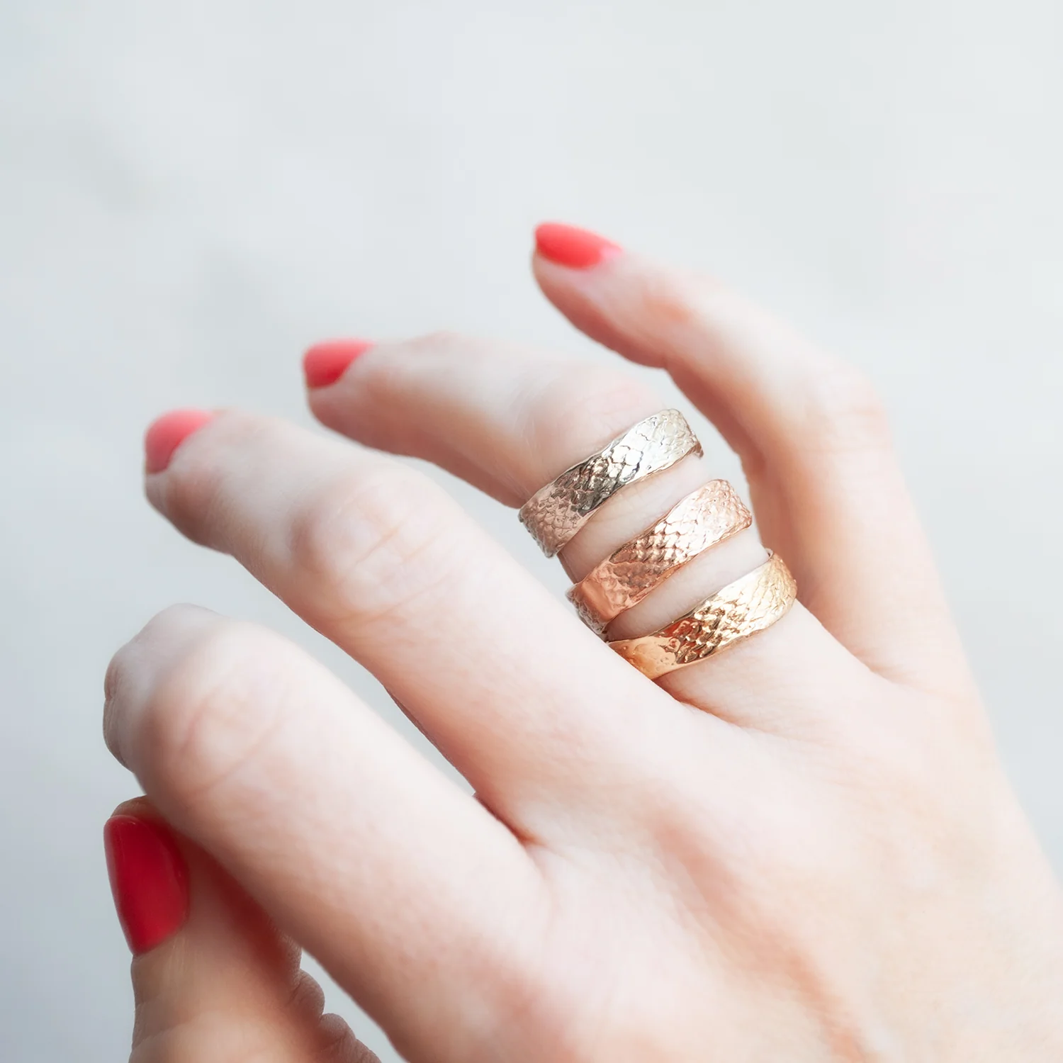 14k yellow gold snakeskin band. Band width is 4-5mm.