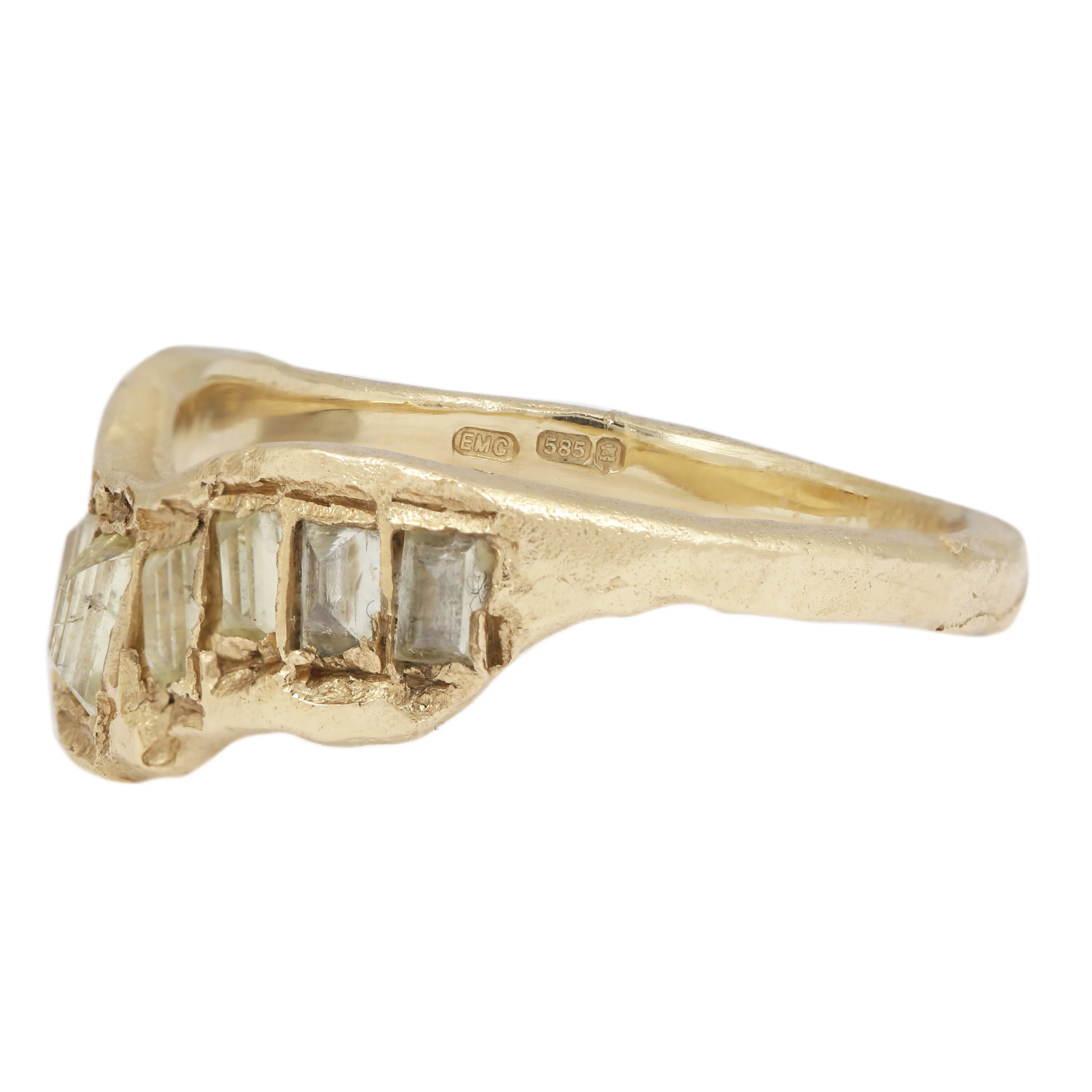 Yellow-hued diamond baguettes scatter across this V-shaped ring by Ellis Mhairi Cameron. Each stone is hand set in softly distressed gold, shining like buried treasure. Ellis draws inspiration from the medieval jewelry hoards found in Scotland. Her rings are unique, beautiful, and mysterious.