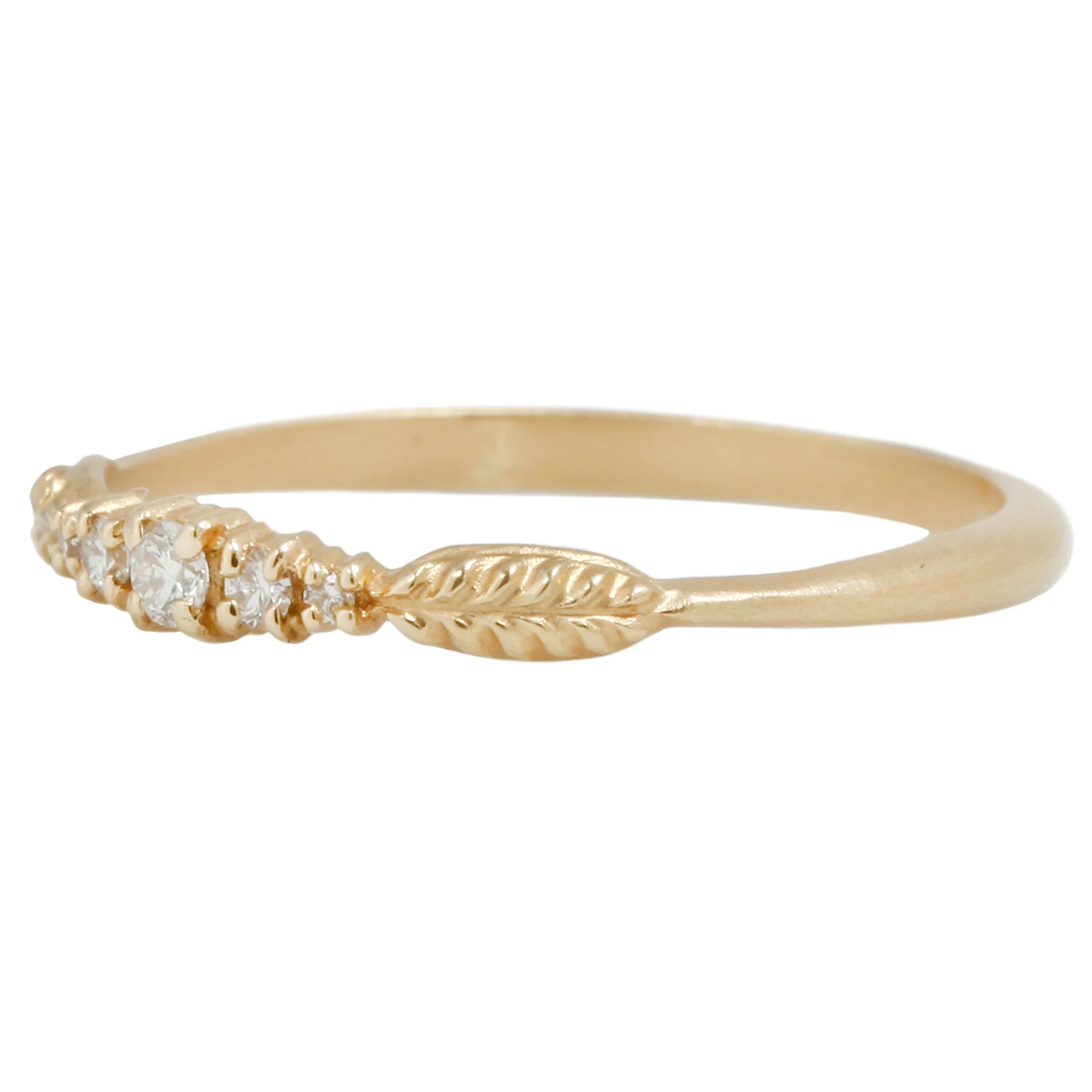 With five white diamonds in graduating sizes, this diamond band is the perfect nesting ring or wedding band. Crafted by Megan Thorne with her sweet evergreen design stamped into the 18k yellow gold. It's a diamond band designed to wear every day.