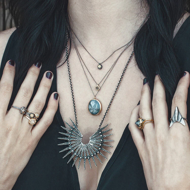 This handcrafted necklace by Lauren Wolf Jewelry features a textured oxidized silver design reminiscent of exotic stingray leather. Its distinctive spiked, irregular form adds a commanding presence, embodying strength and sophistication.