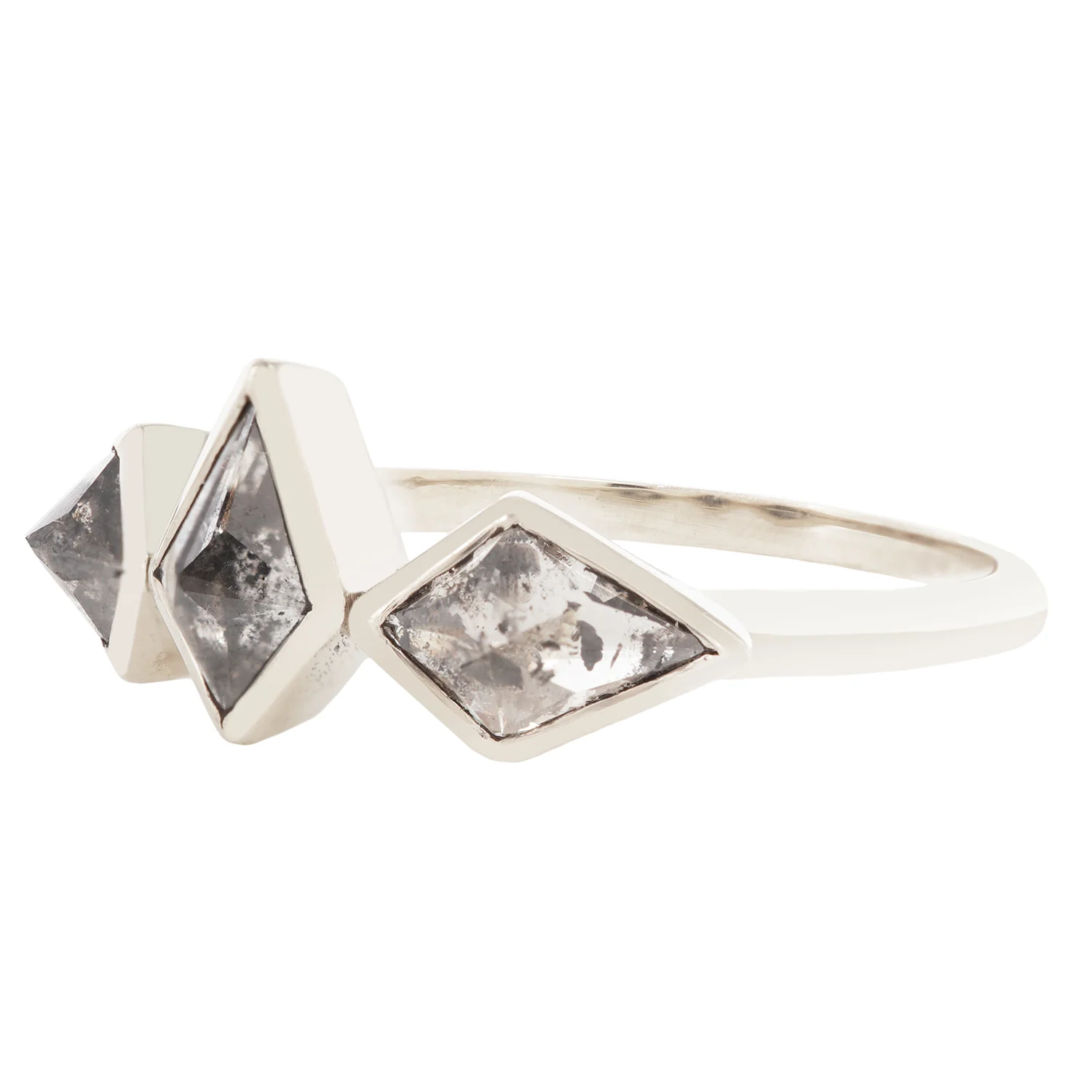Bezels of high polish white gold surround three salt and pepper diamond kites. This one-of-a-kind ring by Lauren Wolf is the perfect encapsulation of her edgy design esthetic and refined diamond setting technique.
