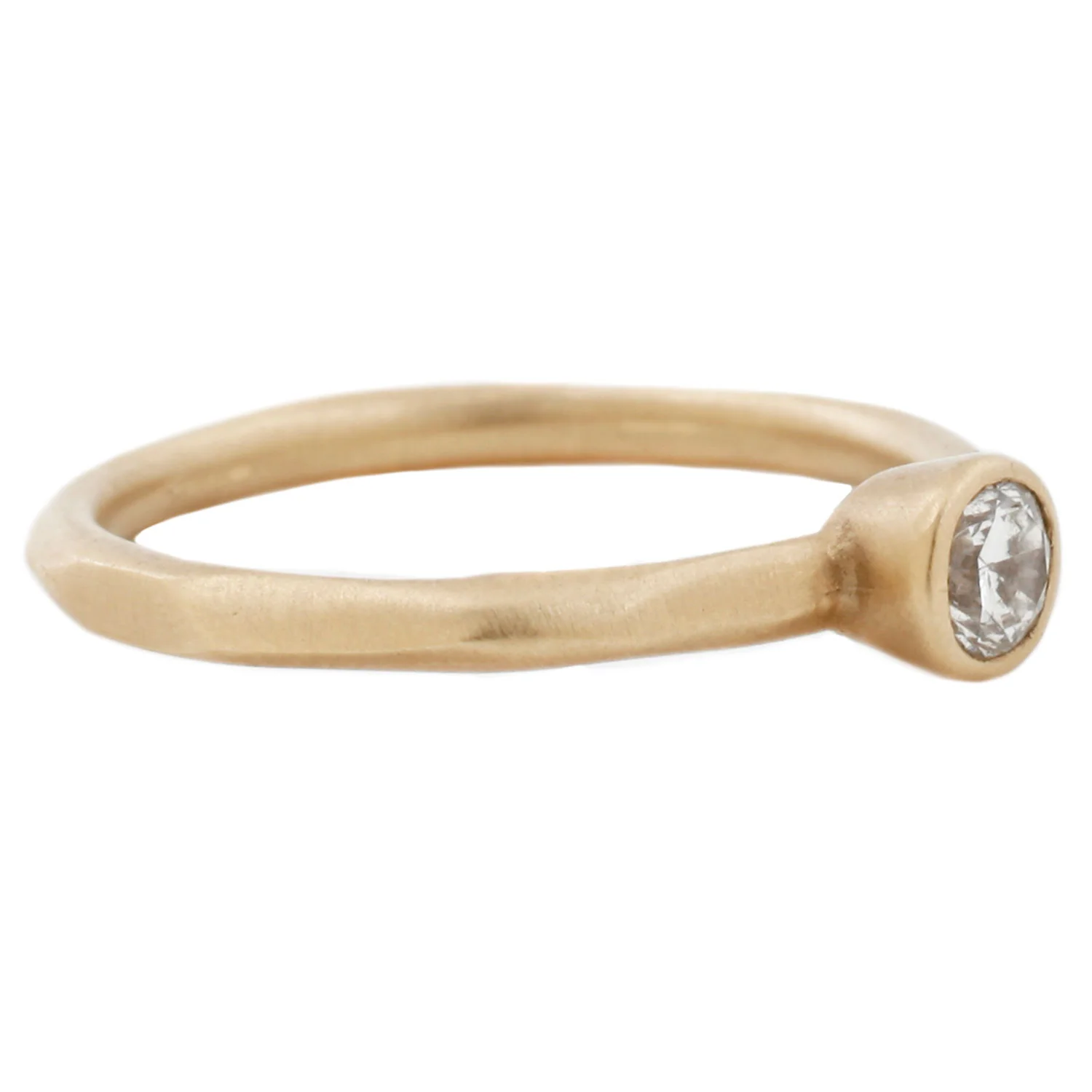 A shimmering brilliant-cut white diamond punctuates Rebecca Overmann's signature water band. Her classic satiny matte 14k yellow gold wraps the shiny stone in a warm golden bezel. A simple yet stunning solitaire perfect for every day.