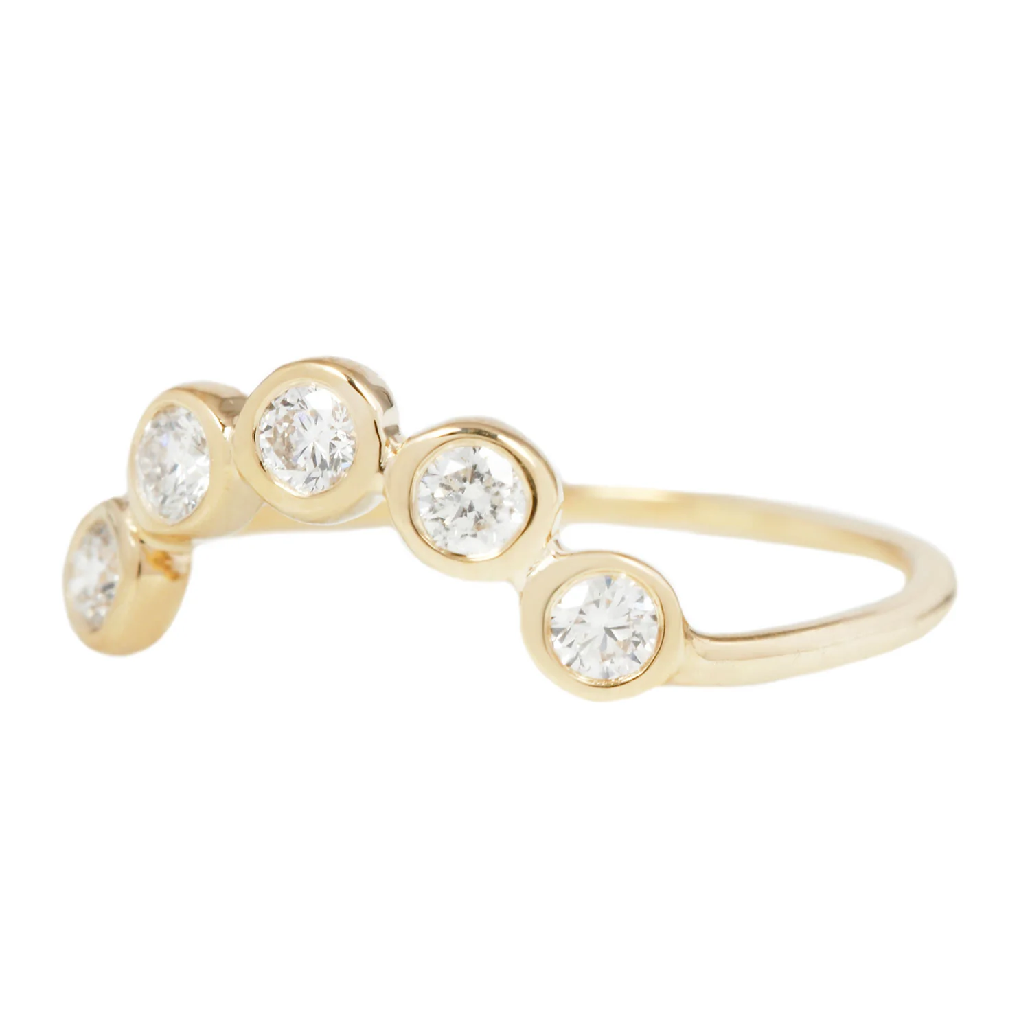 Five bright white diamonds form a lofty arc in gleaming yellow gold. The generous rainbow shape makes it the perfect nesting band for any ring or stack. The Diamond Curve band is a Scosha staple.