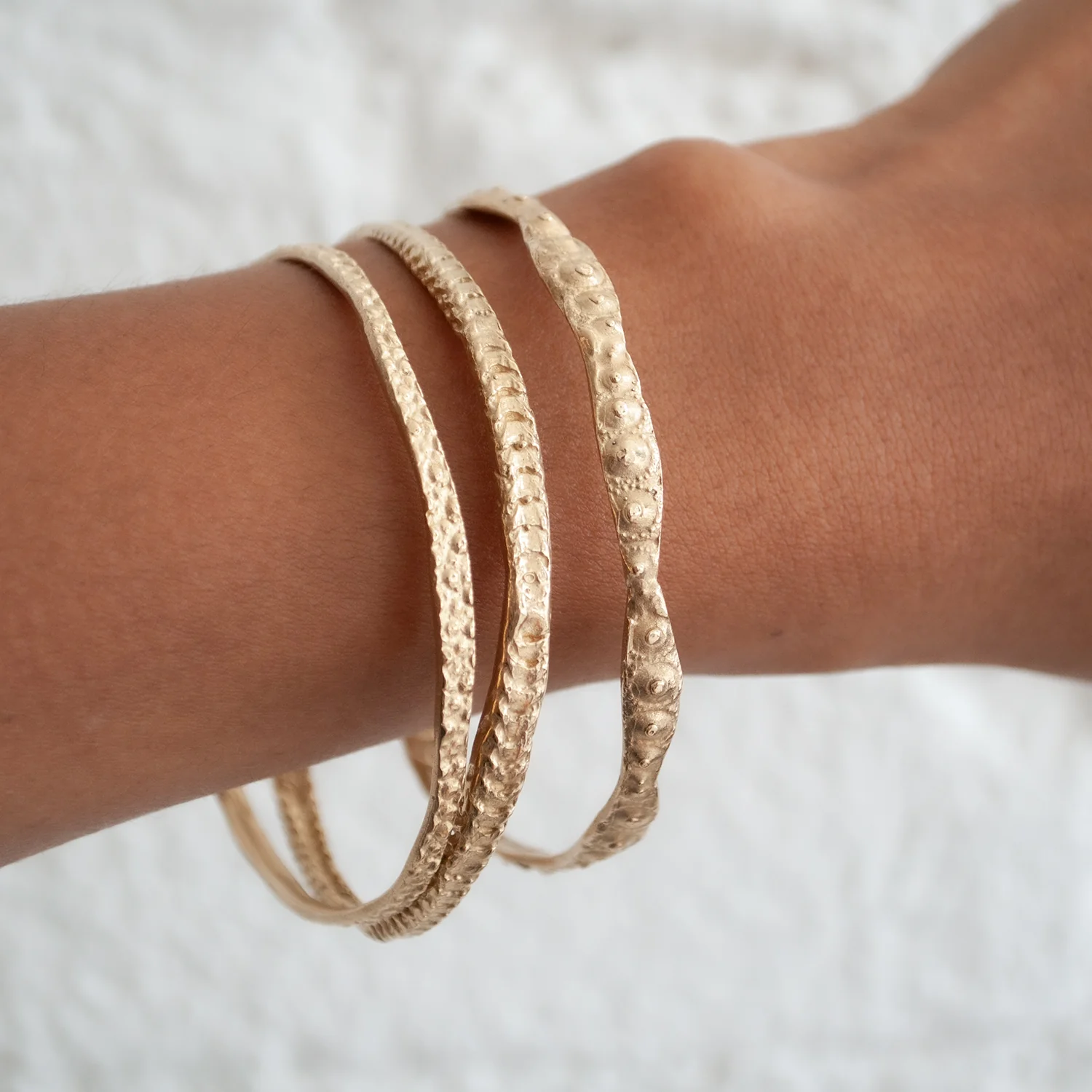 A graceful, yellow gold bangle with an all-over sea urchin texture. The sculpted texture enhances its dimensional shape, creating a bold yet wearable piece for layering or standalone impact. Handcrafted by Lauren Wolf.
