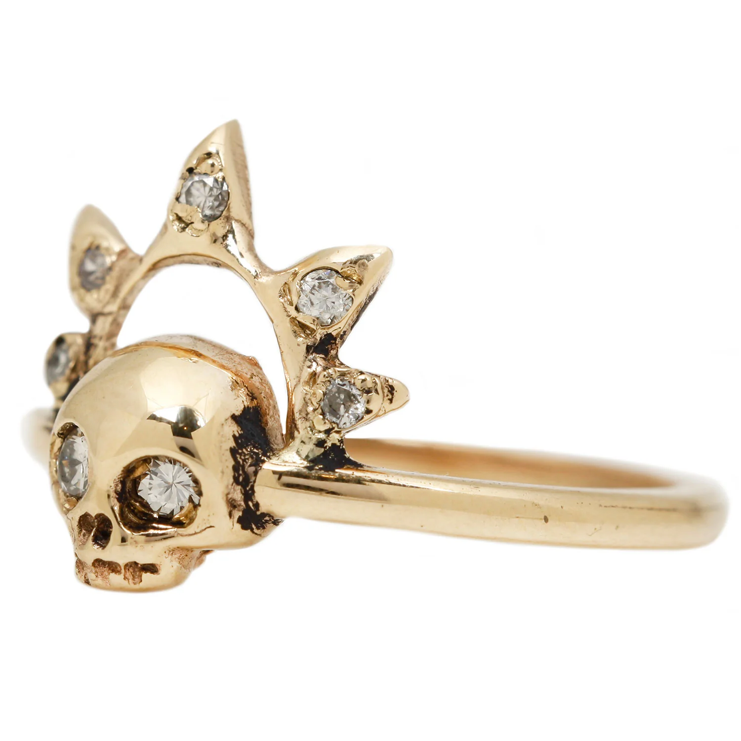 Like a queen entombed in gold, this skull ring has glowing diamond eyes and a studded diamond crown. Skull rings are the perfect piece of everyday memento mori jewelry - a beautiful reminder of the cycle of life and death. Every ring by Michael Spirito begins as a sketch and is meticulously handcrafted.