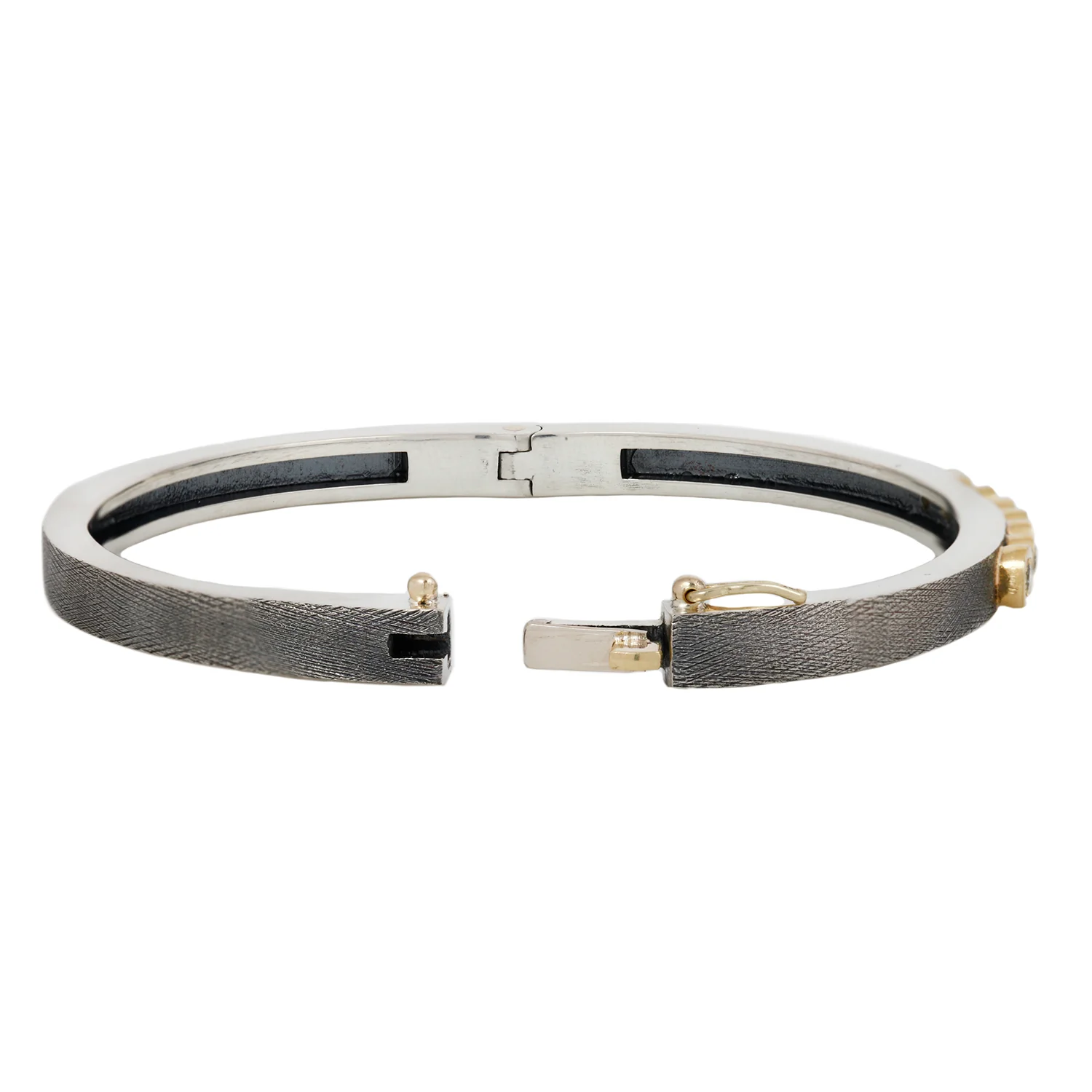 Seven bright white diamonds bubble across an oxidized silver bangle. Their circular gold bezel settings make them pop against the smoky silver backdrop. A gold clasp with safety catch join the gold in contrasting with the cool silver. Edgy meets elegance with this mixed metal bangle from Rene Escobar.