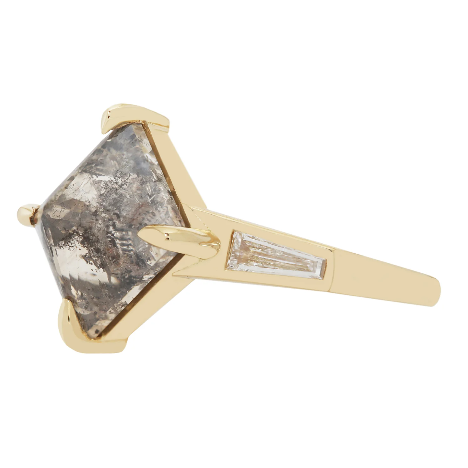 A speckled gray pyramid diamond sits between two baguette diamonds in this ring by Lauren Wolf Jewelry. This large one-of-a-kind piece is super unique and has a high-shine finish.Ā Appraisal available upon request.
