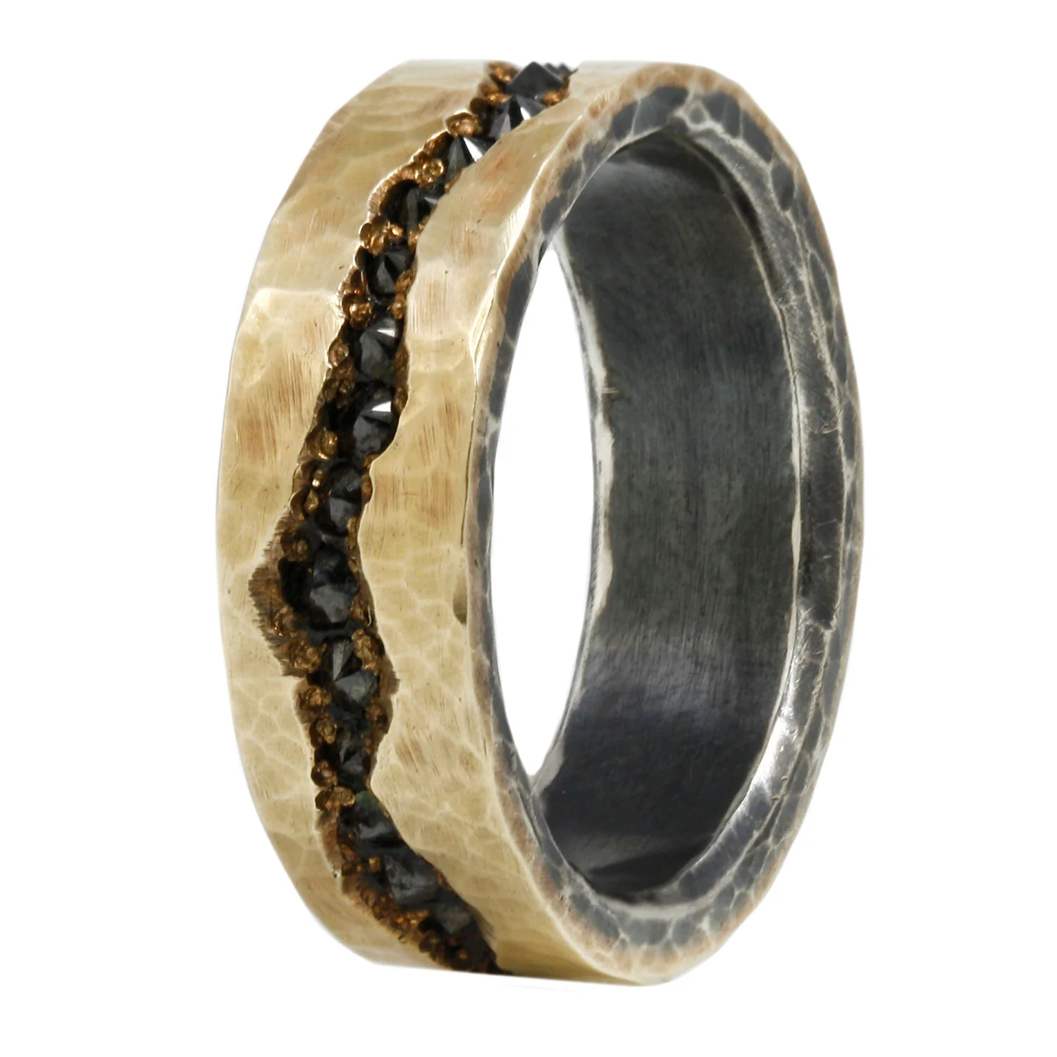 This eternity band features a fissure filled with inverted black diamonds that meanders through the center of the ring. Crafted by TAP by Todd Pownell and featuring his signature mixing of metals - the hand-hammered gold exterior is fused over sterling silver with a blackened interior. Wear this thick and rugged band to symbolize a union or make a statement.