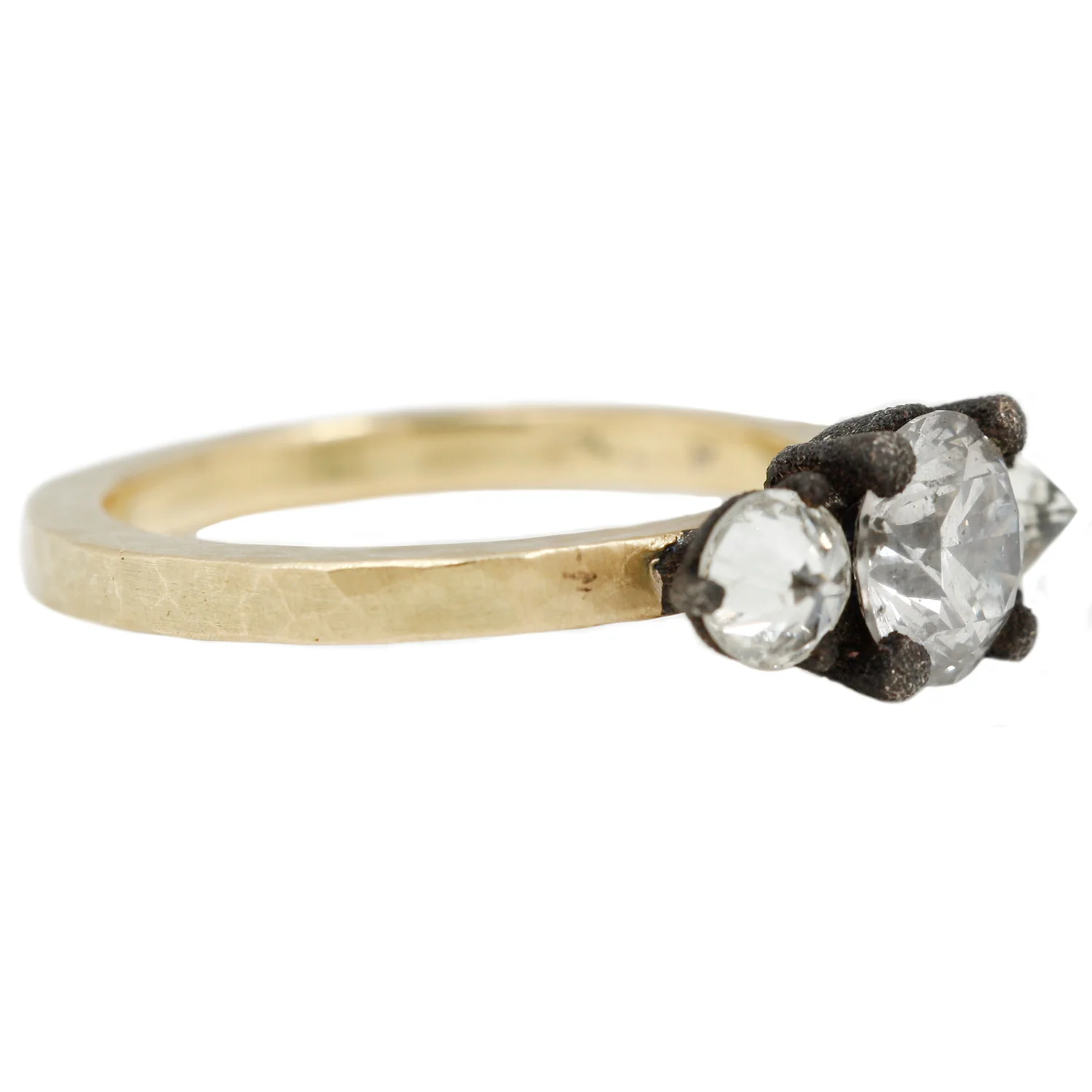 A classic beauty with an edge, this three diamond ring boasts a shimmering, brilliant-cut diamond with point-up inverted diamonds on either side. Darkened white gold prongs clasp each reclaimed stone along an 18k yellow gold band. This TAP by Todd Pownell original is a future heirloom in the making.