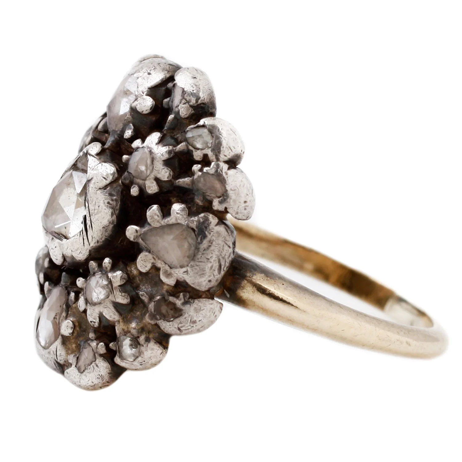 This stunning vintage halo ring is bursting with diamonds. Ornate silver details surround the stone, with a yellow-gold halo and band - an enchanting mixed-metal look that's typical of the Georgian era. Enhancing the sparkle, even more, is foil backing, which should be worn with care and not submerged in water. A one-of-a-kind vintage ring that brings the best of Georgian-era jewelry to your finger.