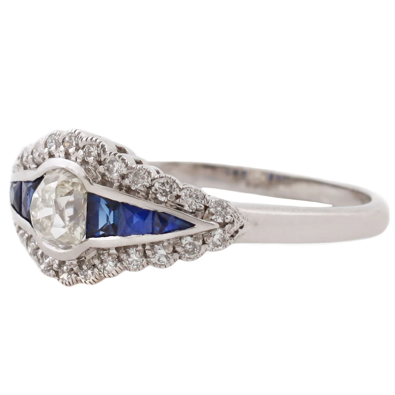 18k white gold Art Deco ring circa 1920. Featuring a bright white central oval diamond flanked by 3 blue sapphires on each side, surrounded by pavé diamonds in a marquise shape. Setting measures 8mm at tallest point and 2mm at the back of the band.