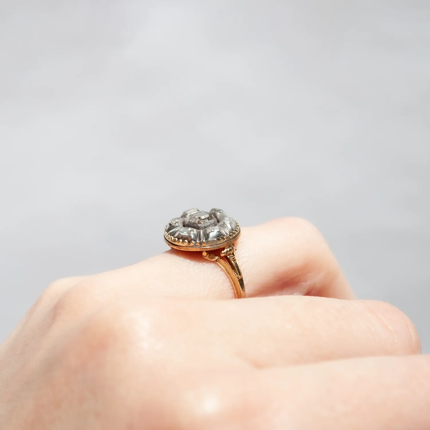 Vintage late Georgian ring set in 12k yellow gold and silver. Featuring 7 round, flat cut diamonds in aĀ setting that measures 12mm in diameter and sits on a 2mm wide band. This ring's sparkle is enhanced by foil backing, which should be worn with care and not submerged in water.Ā