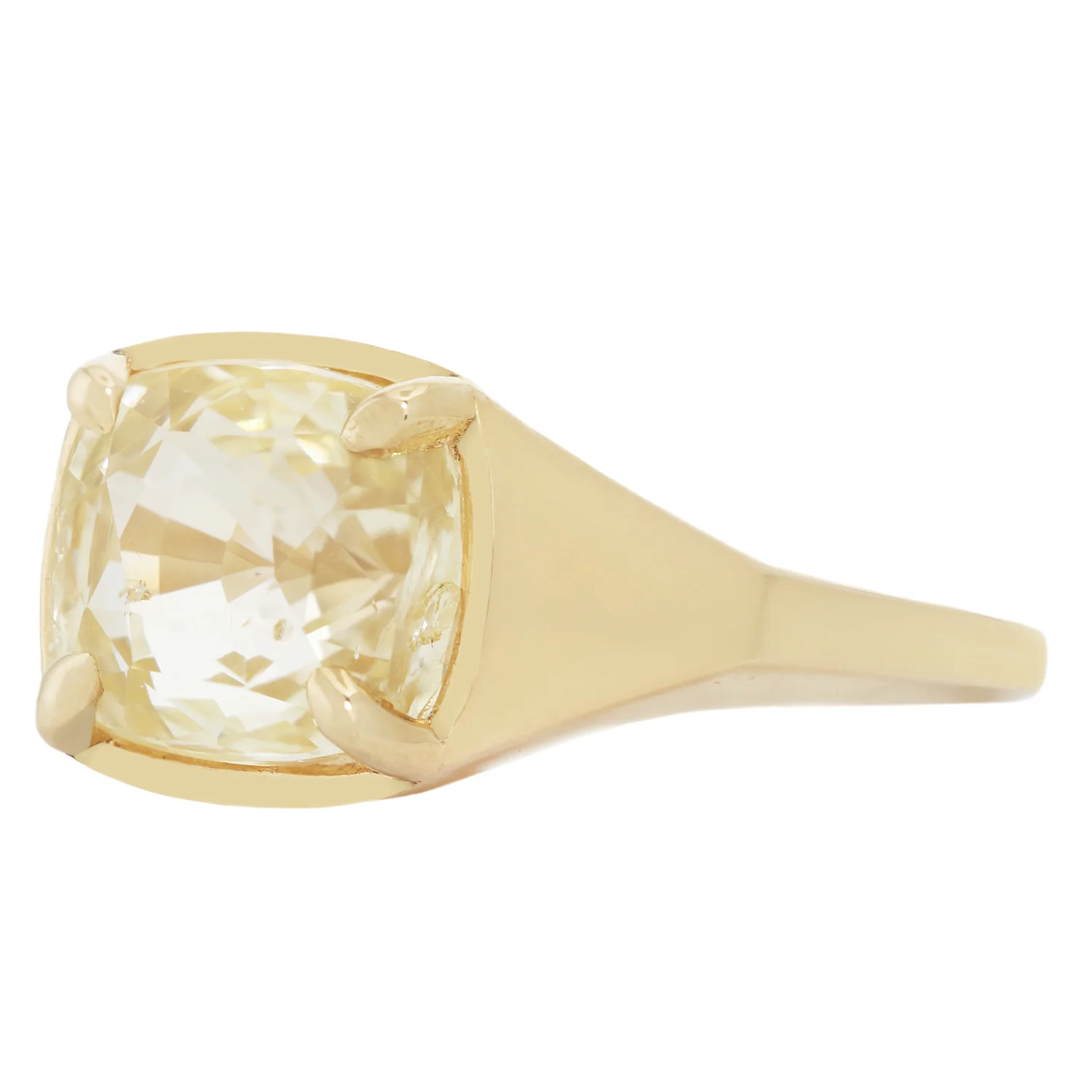 Make a vibrant statement with this bright, shining, one-of-a-kind ring by Lauren Wolf. The high-shine gold setting joyfully complements the gleaming yellow shade of this large prong set sapphire. Appraisal available upon request.